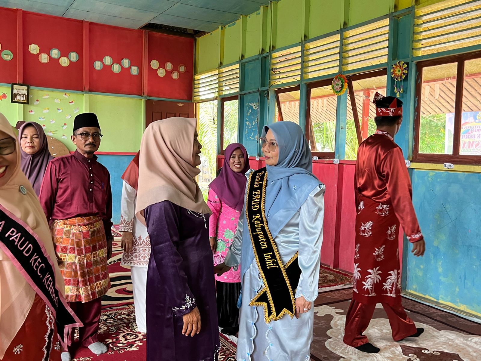 Bersama Bupati Indragiri Hilir (Inhil) Herman, Bunda Pendidikan Anak Usia Dini (PAUD) sekaligus Bunda Literasi Katerina Susanti Herman, kunjungi PAUD Kelompok Bermain Nur Ismail yang terletak di Dusun Kelapa Gading, Desa Pekan Tua, Kecamatan Kempas.