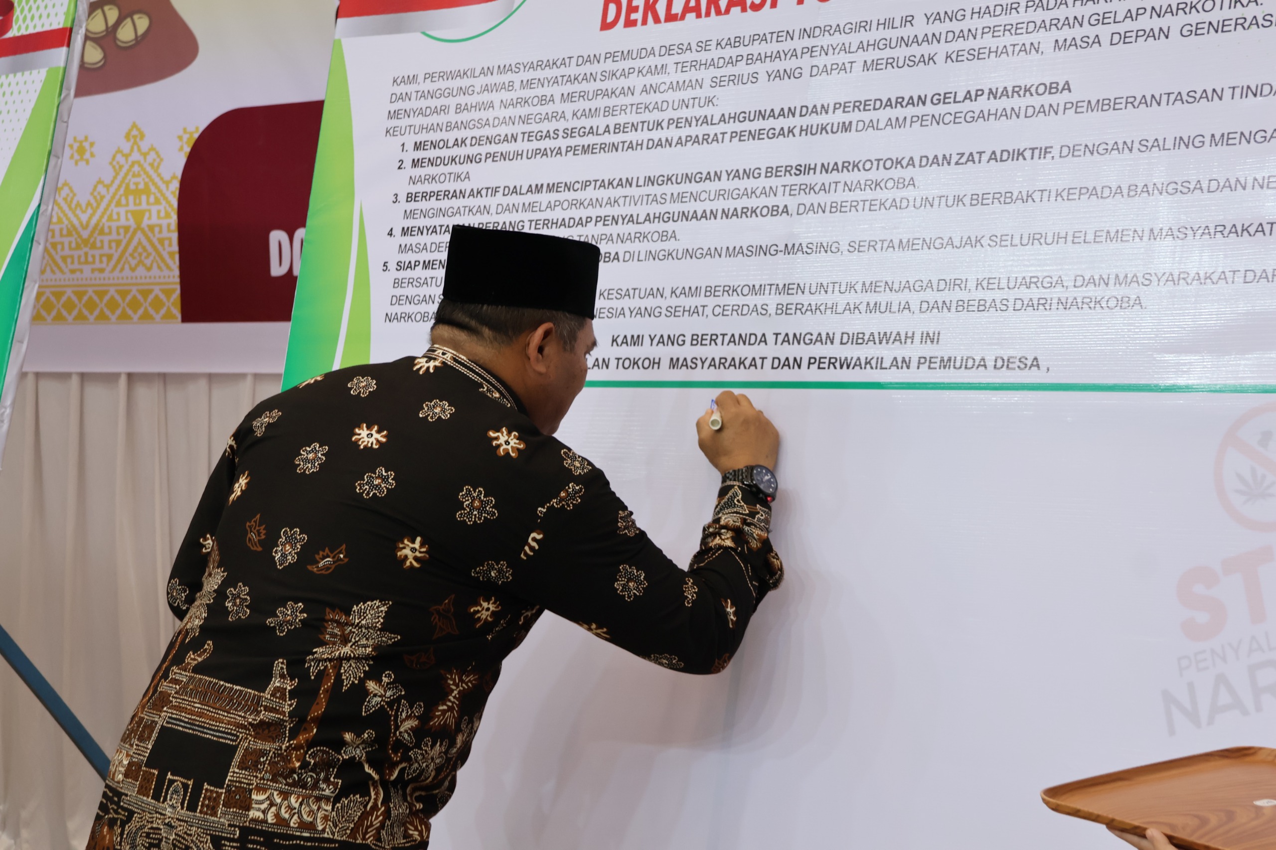 Pada akhir kegiatan, Bupati diwakili Staf Ahli, Unsur Forkopimda dan stakeholder terkait, secara bersama mengucapkan deklarasi tolak Narkoba serta melakukan penandatanganan, sebagai wujud komitmen bersama dalam menciptakan Inhil bersih dari Narkoba.