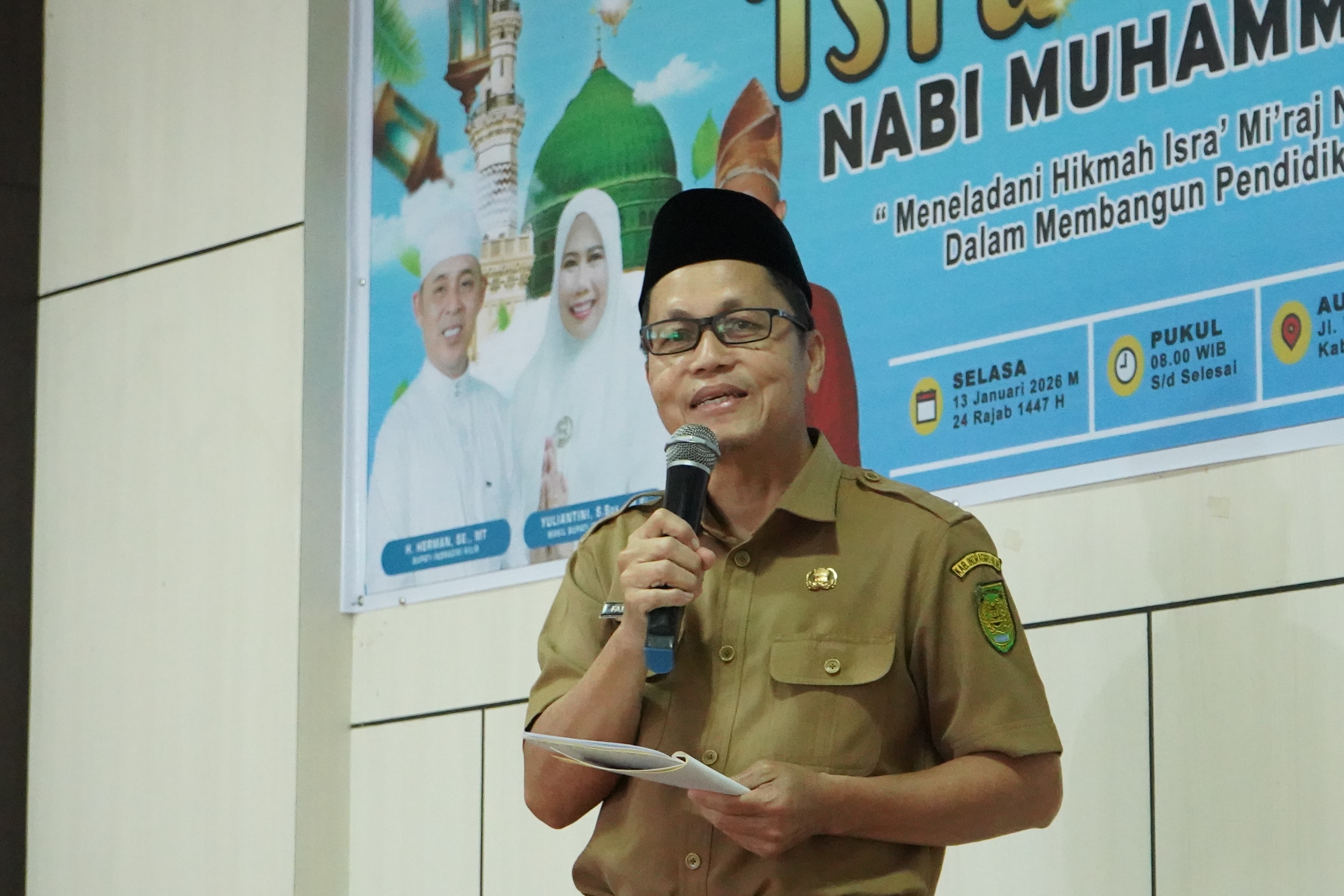 Bupati Indragiri Hilir (Inhil) diwakili Asisten Pemerintahan dan Kesejahteraan Rakyat Sekretariat Daerah Inhil, Fajar Husin, hadiri Peringatan Isra Mi'raj Nabi Muhammad SAW 1447 H yang ditaja Dinas Pendidikan (Disdik) Inhil.