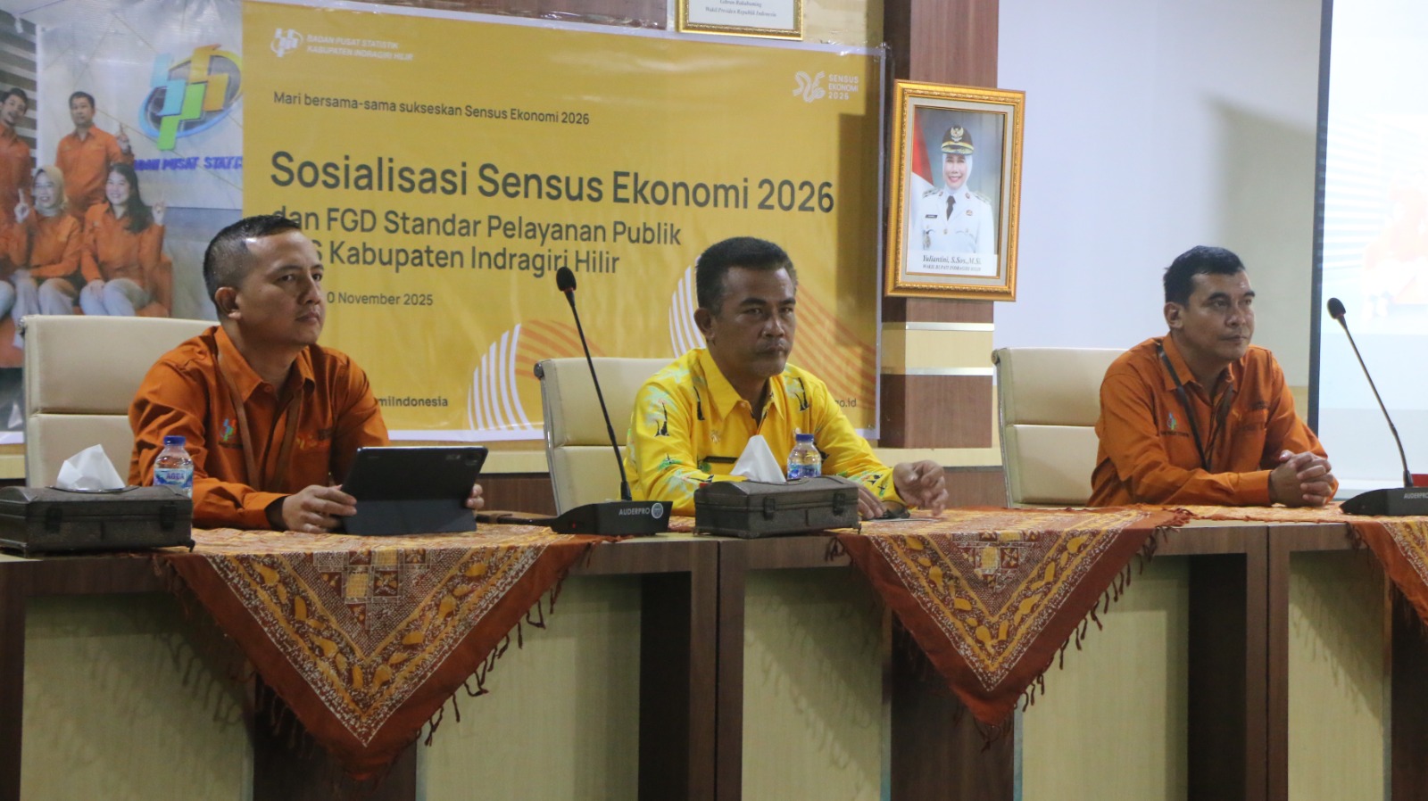 Bupati Indragiri Hilir (Inhil) diwakili Asisten Ekonomi dan Pembangunan Sekretariat Daerah (Setda) Inhil, Dwi Budianto, buka resmi Sosialisasi Sensus Ekonomi 2026 sekaligus Focus Group Discussion Standar Pelayanan Publik, tajaan Badan Pusat Statistik (BPS).