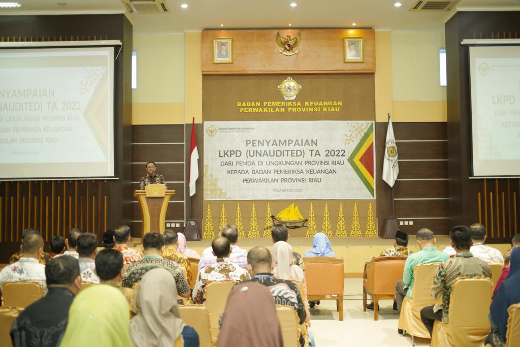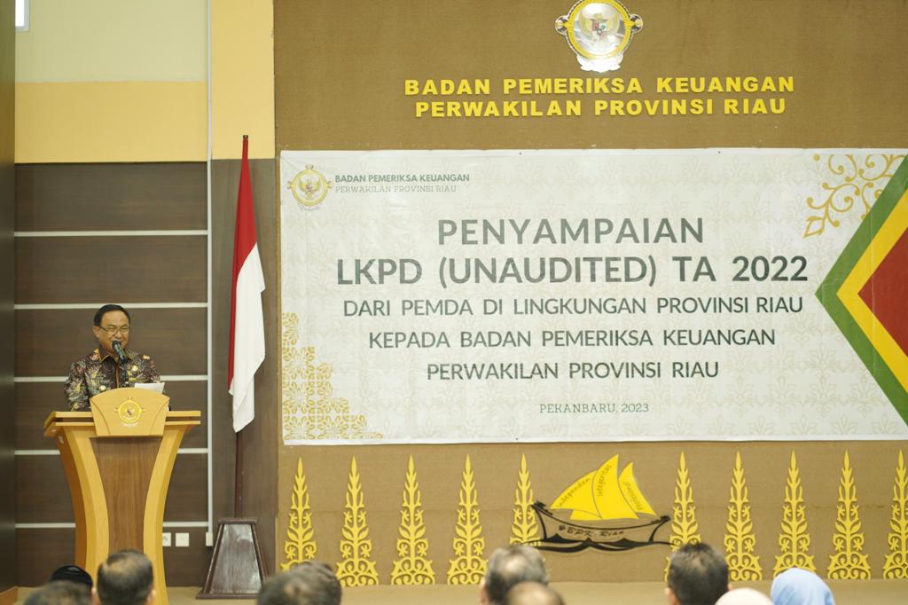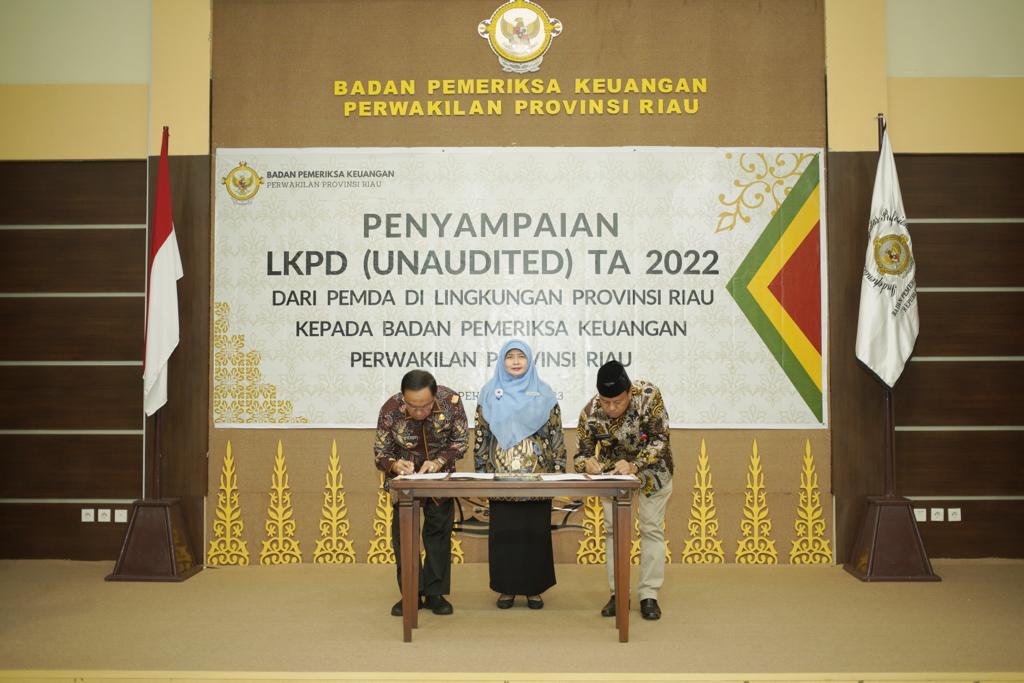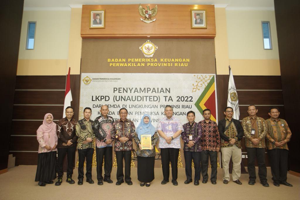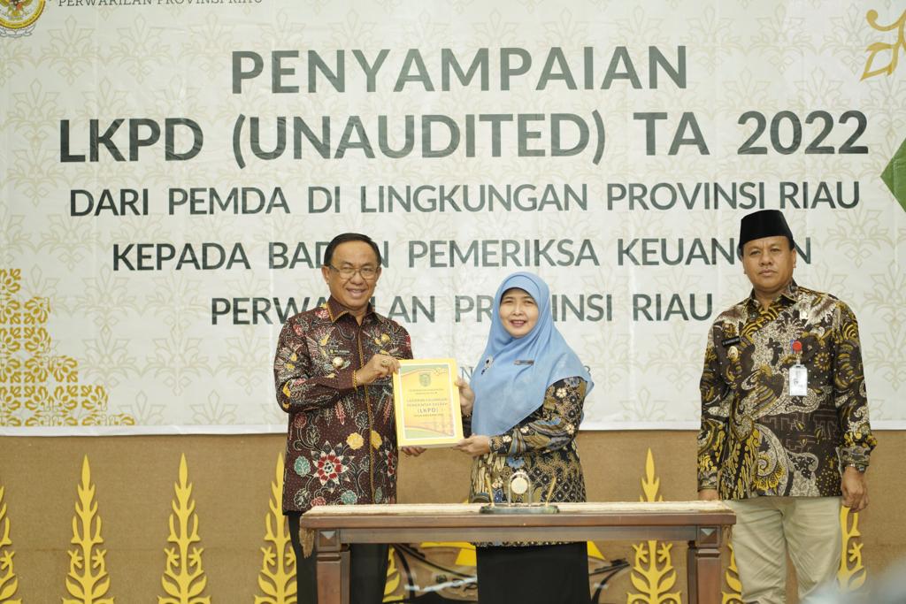 INDRAGIRI HILIR,- Bupati Indragiri Hilir Drs. H.M Wardan menyerahkan Laporan Keuangan Pemerintah Daerah (LKPD) Unaudited Tahun Anggaran 2022 Kabupaten Inhil kepada Badan Pemeriksa Keuangan Republik Indonesia (BPK RI) Perwakilan Provinsi Riau, di Pekanbaru, Jumat, (10/03).