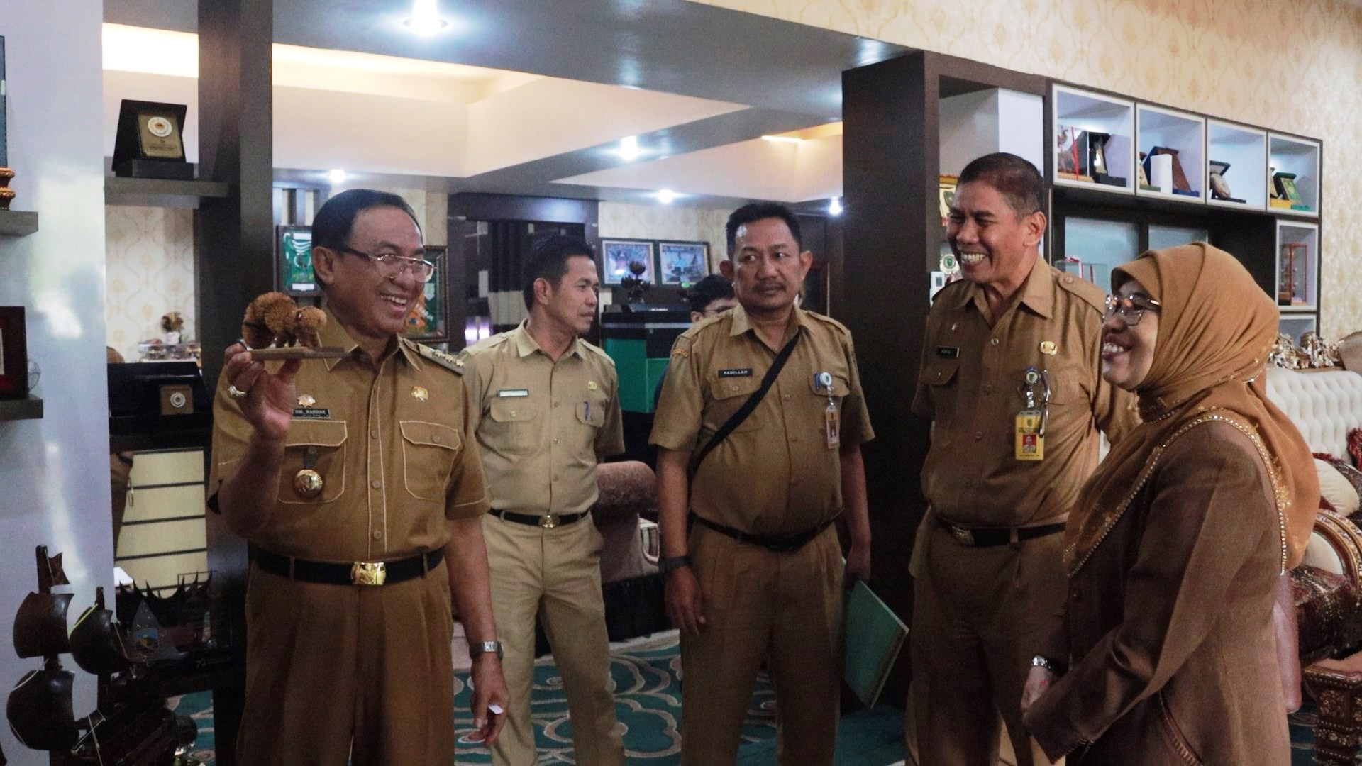 Usai sarapan, bupati berkesempatan mengenalkan sejumlah kerajinan berbahan kelapa hasil olahan masyarat Inhil.