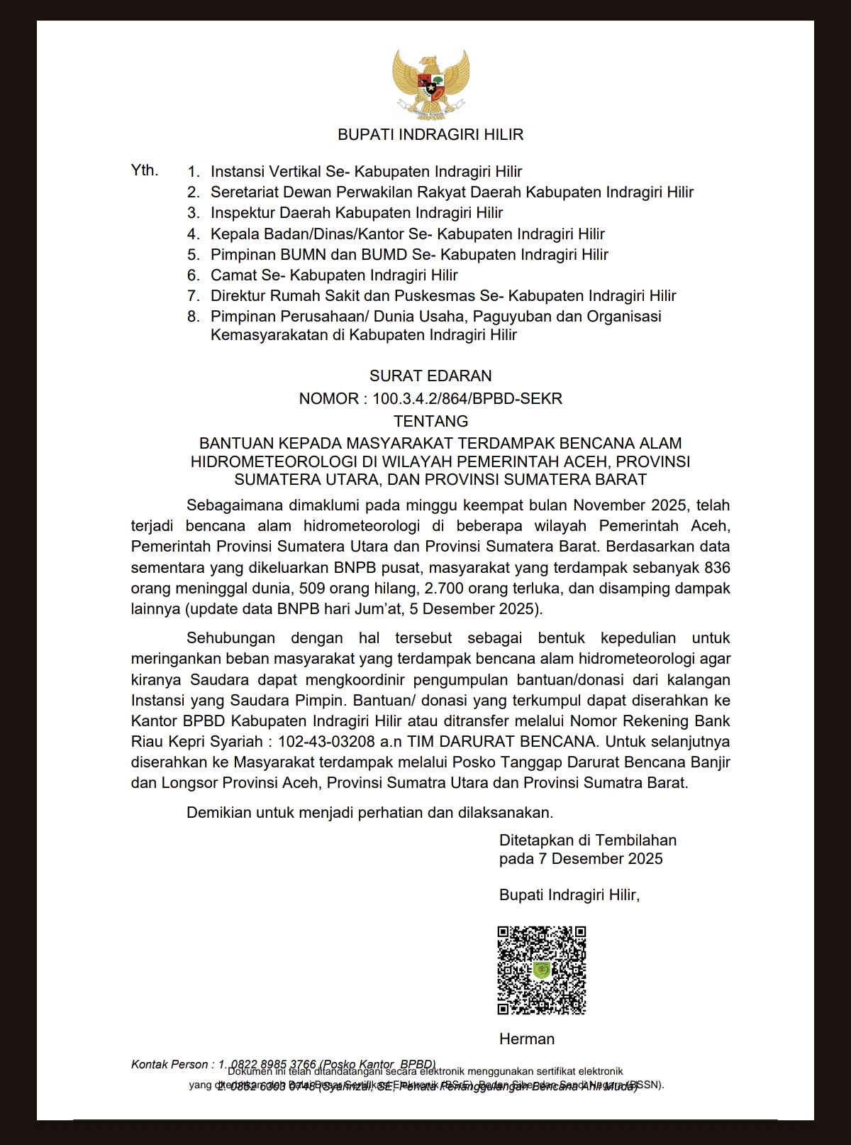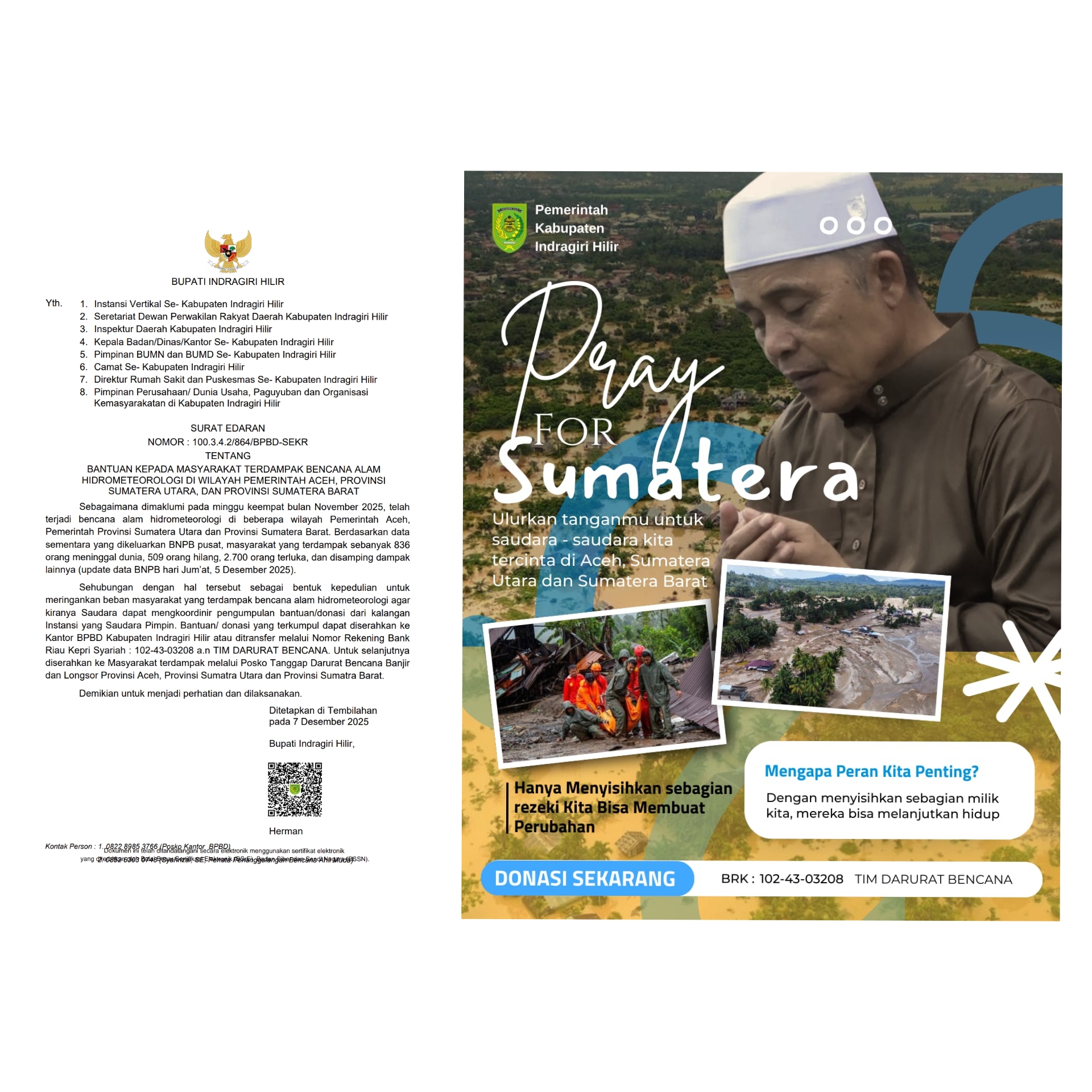 Tembilahan – 7 Desember 2025. Bupati Indragiri Hilir, Herman, menyerukan gerakan solidaritas massal untuk membantu masyarakat yang terdampak bencana alam hidrometeorologi di Provinsi Aceh, Sumatera Utara, dan Sumatera Barat. Seruan itu disampaikan melalui Surat Edaran Nomor 100.3.2/086/BPBD-SEKR yang resmi dikeluarkan pada 7 Desember 2025.
