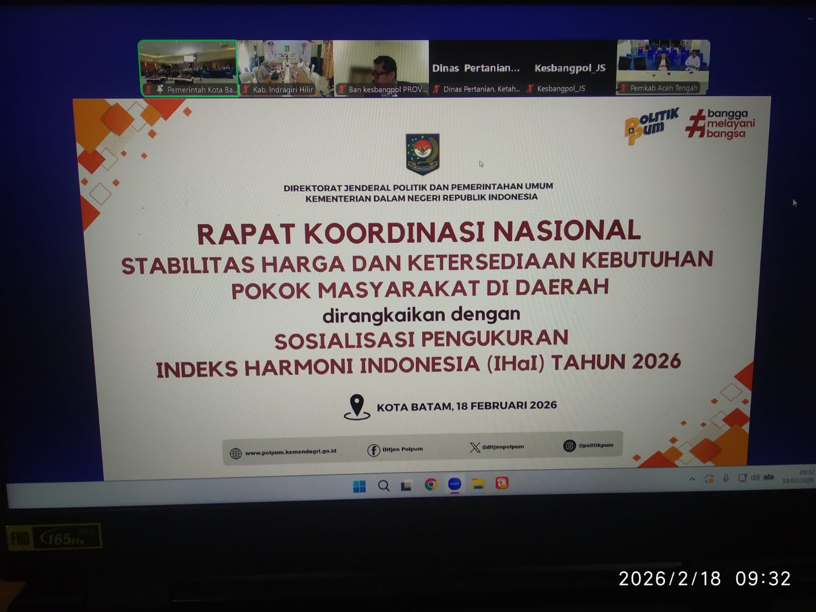 Tembilahan – Bupati Indragiri Hilir (Inhil) H. Herman diwakili Kepala Badan Kesatuan Bangsa dan Politik (Kesbangpol) Kabupaten Indragiri Hilir, Zailani, S.Sos., mengikuti Rapat Koordinasi Nasional (Rakornas) Stabilitas Harga dan Ketersediaan Kebutuhan Pokok Masyarakat di Daerah yang dirangkaikan dengan Sosialisasi Pengukuran Indeks Harmoni Indonesia (IHaI) Tahun 2026, Rabu (18/2/2026).