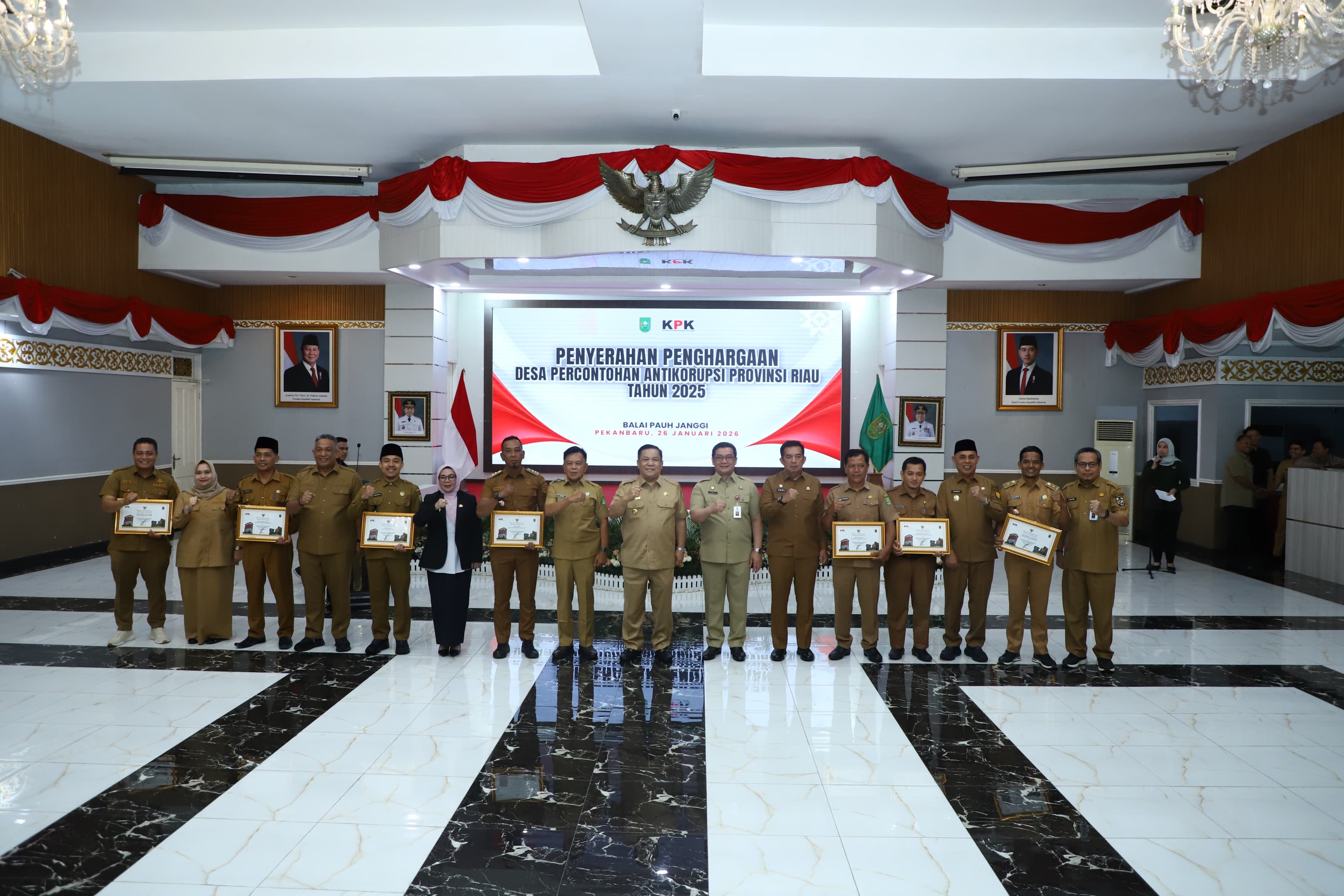 Pekanbaru,- Bupati Indragiri Hilir H. Herman, SE, MT didampingi Inspektur daerah, Kadis PMD dan Kadis Kominfopersantik Inhil serta Kades Sungai Intan menghadiri penyerahan penghargaan Desa Percontohan Antikorupsi Provinsi Riau Tahun 2025, Senin (26/01/2026).